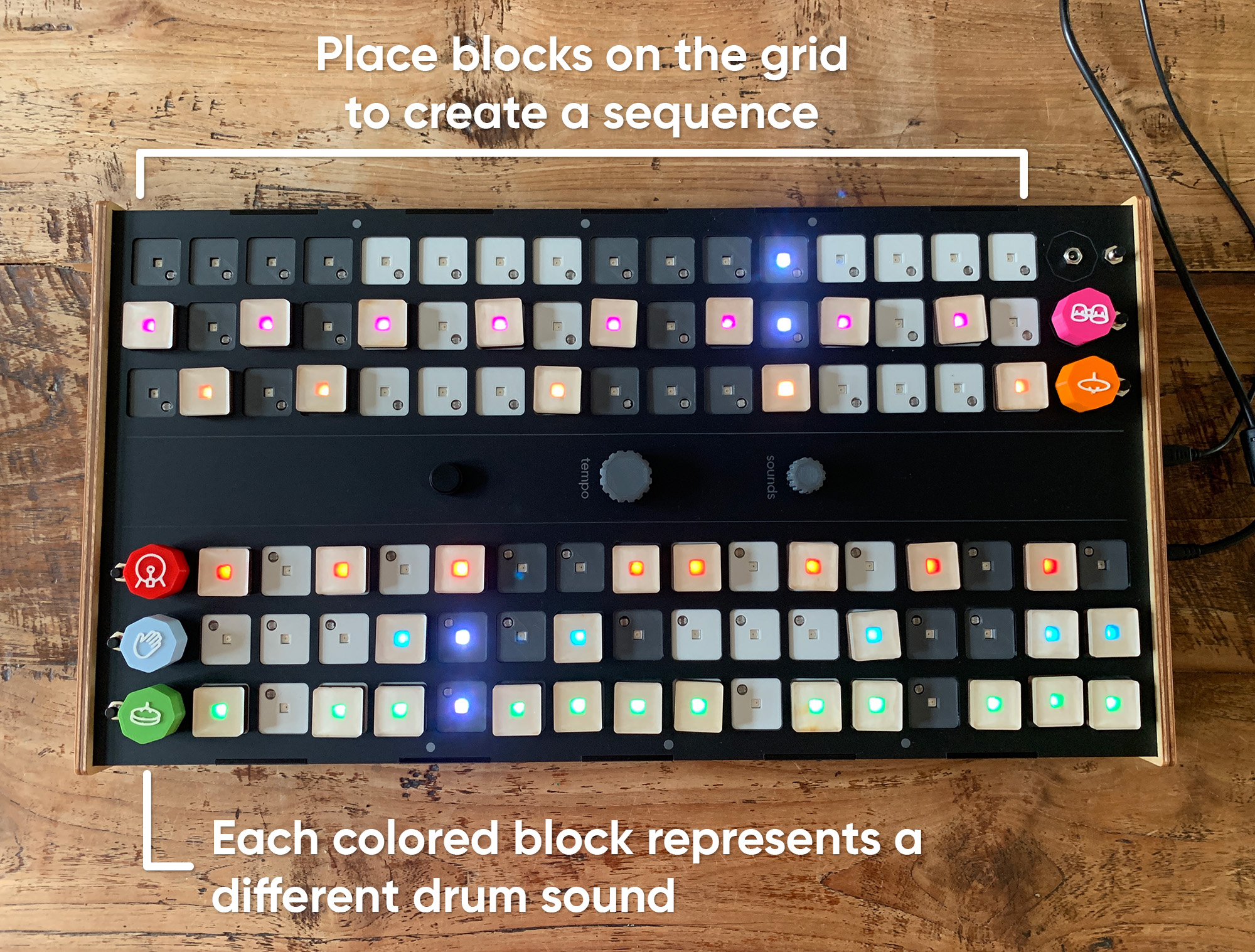 program a sequence. Each row can play a different type of drum sound, colored hexagonal blocks