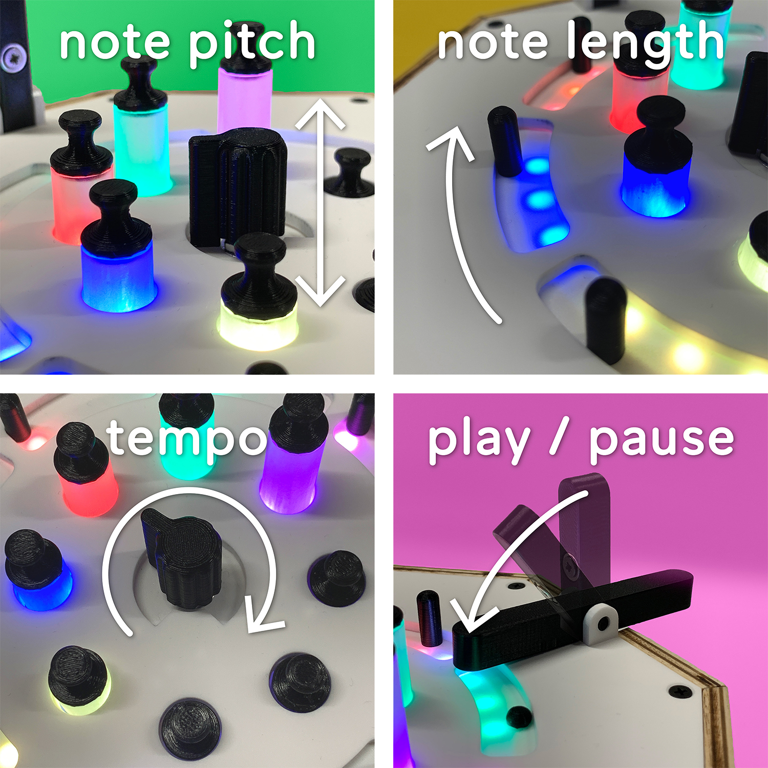 Modern music-making tools such as synthesizers give musicians many options to create any sound they want. However, these tools can be hard to understand for people without prior musical experience because of their complex features. I believe that tangible user interfaces and embodied interaction create an opportunity for making easy-to-understand interfaces. Music-making devices often use the same interaction for multiple functions, such as sliding or twisting, but designing specific interactions allows the form to explain the function inherently.